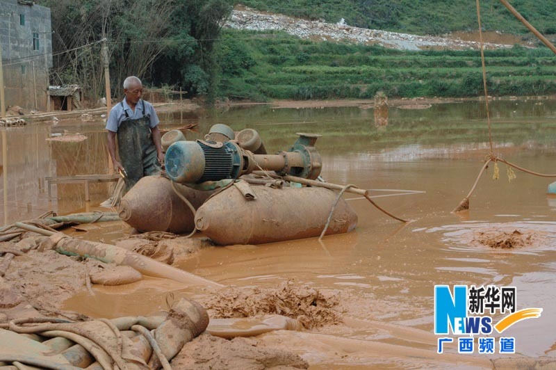 華銀鋁在與德保縣毗鄰的靖西縣境內建設的龍山排泥庫連續發生泥漿泄漏,讓靖西縣新甲鄉部分群眾苦不堪言。記者在靖西縣新甲鄉新榮街見到的景象仍觸目驚心:泥漿泄漏淹沒了大片水稻田,渾黃的污水覆蓋了大片田地,與周邊的青山形成鮮明的對比。在新甲鄉新榮街坡珠屯,遍地泥漿已淹沒通往屯里的道路,屯里幾乎不再有群眾居住,房屋上仍能看出泥漿淹沒過的痕跡。村民們說,如今房子不能住,水也不能喝,連莊稼都種不了。