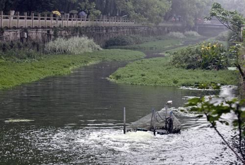 溫州市區九山外河中,一臺潛水離心式曝氣機正在工作,產生涌泉般的水流像“趵突泉”,給河面增添了幾分生氣。 這種造流曝氣機工作時能給河水充氧,提高水體溶解氧的濃度,增強水體的自凈能力,以改善水質。在長約1公里的九山外河,共有20套造流曝氣機,每天工作8小時。此外,外河道里還種植了旱傘草、美人蕉等挺水植物,以及睡蓮等浮水植物,共同組成河道的生態修復工程。