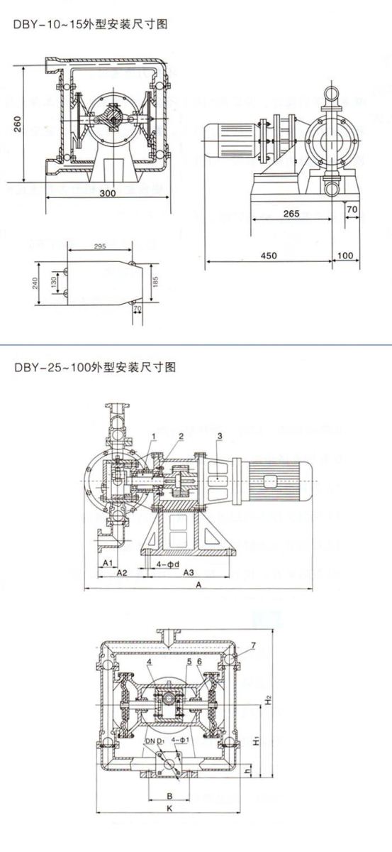 DBY-50-65-80-100擺線式流體部位內襯氟防爆電動隔膜泵外型尺寸圖