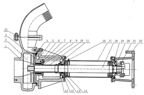 1、泵體 2、葉輪 3、泵蓋護板4、泵體膠墊 5、泵蓋 6、泵座7、油封 8、油封壓蓋 9、軸套 10、定位套 11、調(diào)整螺母 12、封塵端蓋 13、泵聯(lián)器 14、油封 15、軸承(6313) 16、注油杯 17、中段 18、軸 19、上軸承壓蓋 20、油封 21、泵聯(lián)器 22、電機支架 23、出水彎管