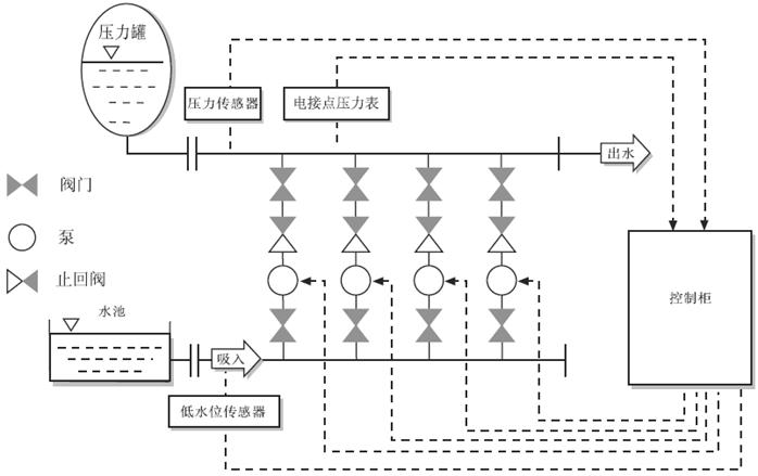 當管網壓力大于啟動壓力時設定值時由與出水管路連接的壓力罐供水,如果管網壓力等于啟動壓力設定值時啟動水泵,水泵運行中管網壓力達到停止壓力時停止水泵運行,水泵啟動后管網壓力超過啟動壓力,未達到停止壓力時水泵繼續運行;水泵全速運行后管網壓力未達到啟動壓力時水泵追加啟動。