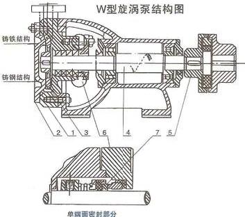 4、W型旋渦泵的密封形式有軟填料密封和單端面機(jī)械密封。除WB和WM型泵用單端面機(jī)械密封外泵出廠時(shí)一律裝軟填料密封。如用戶需要其它型式的軸封要在訂貨時(shí)說明。