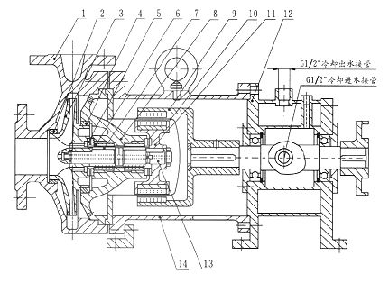 CQG型耐高溫磁力驅動泵(耐溫≤250℃)(簡稱磁力泵)通常由電機,磁力偶合器水冷卻裝置和耐腐蝕離心泵四大部分組成,其主要特點是利用磁力偶合器傳遞動力,完全無泄漏。當電動機帶動磁力偶合器的外磁鋼旋轉時,磁力線穿過了間隙和隔離套,作用與內磁鋼上,使泵轉子與電動機同步旋轉,無機械接觸地傳遞扭矩。在泵的動力輸入端,由于液體被封閉在靜止的隔離套內,沒有動密封因而無泄漏,磁力偶合器的磁性材料采用了高溫介質而保持強大的磁力扭矩。在電機與磁力偶合器之間加裝了水冷卻裝置,防止泵送高溫介質之熱量傳導至電機。以保持電機的正常運轉,從而達到無泄露輸送高溫介質。CQG型高溫磁力泵的過流部件根據需要可分別采用304、304l、302、321、316、316l、ub6、cd4mcu、鈦合金、鎳基合金等耐腐蝕材料。 高溫磁力泵是全國聯合設計開發的新型完全無泄漏耐腐蝕泵,其技術經濟指標接近國外同類產品水平,其型式、基本參數及技術性能符合jb/t7742-95《小型磁力傳動離心泵》的標準要求主要用途及適用環境。