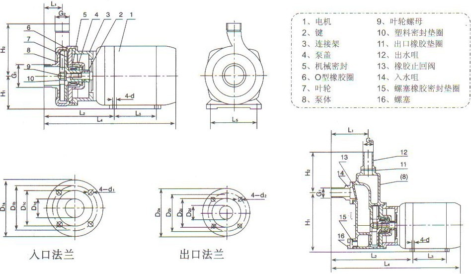 防爆直聯(lián)式半開式葉輪食品級不銹鋼自吸泵安裝尺寸結構圖