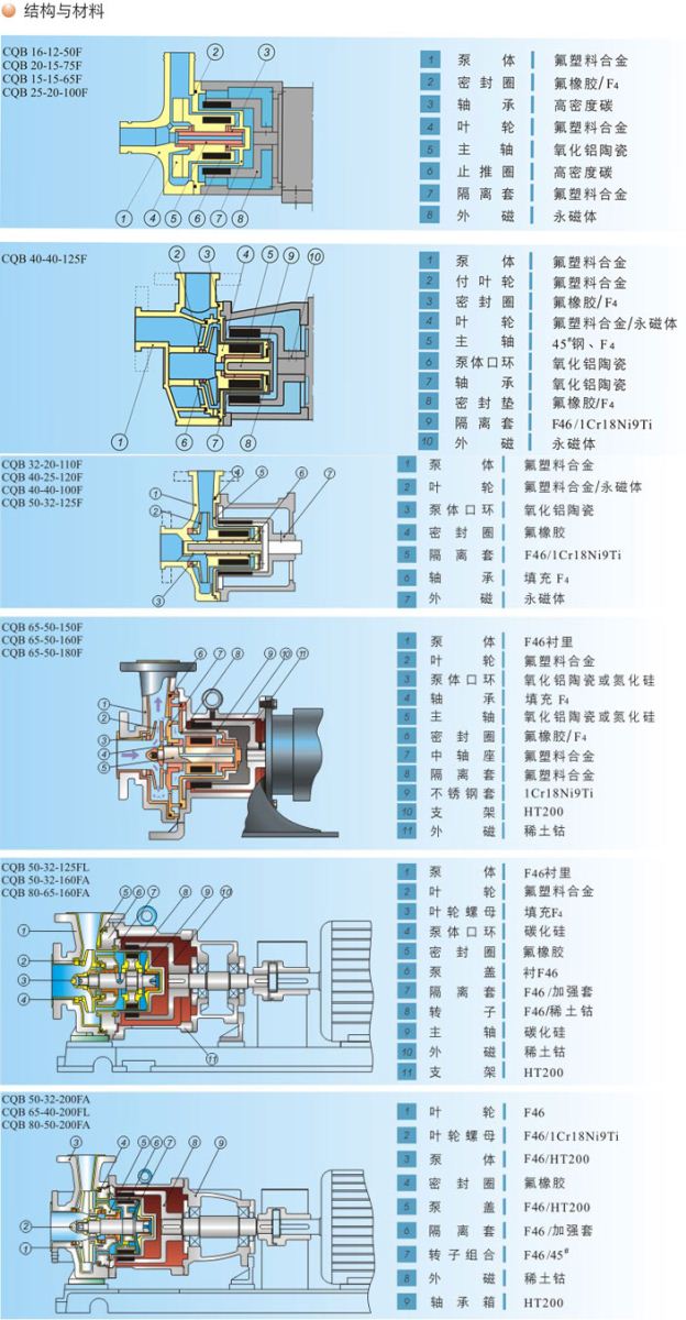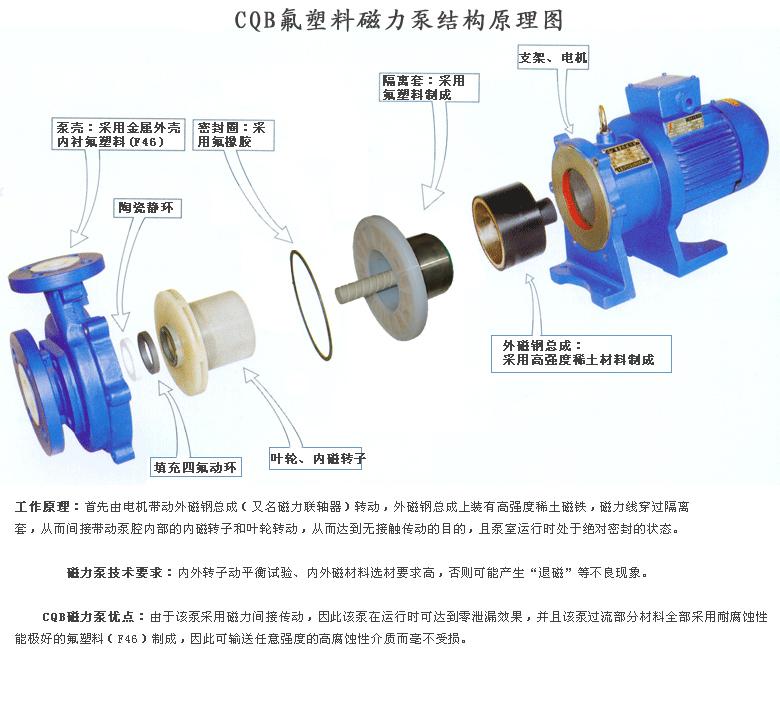 CQB型磁力泵是化工流程中杜絕跑、冒、滴、漏現象,消除環境污染,創造“無泄漏車間”、“無泄漏工廠”,實現安全、文明生產的理想用泵。