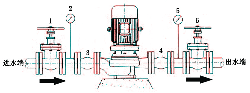 1、管道泵:管道泵是進(jìn)出口在同一直線上且口徑相同的離心泵,可像一段管道串聯(lián)安裝在管道的任何位置故取名為管道泵。其是根據(jù)泵的外形特診來定義命名的,若根據(jù)原理命名,管道泵是特殊結(jié)構(gòu)的離心泵,而普通的離心泵可能是臥式端吸式的,也可能是立式多級離心式的。如下圖1: