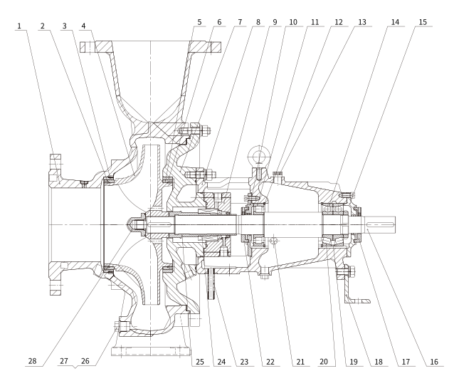 該系列泵閉式、半開始葉輪采用平衡加耐磨環平衡軸向力,開始葉輪采用背葉片平衡軸向力。出口直徑80mm以上泵設計成雙蝸殼平衡徑向力,因而保證了軸承的使用壽命和軸封處的擾度。軸承根據不同的工況采用圓柱滾子、圓錐滾子軸承配對,大大提高了軸承的使用壽命。