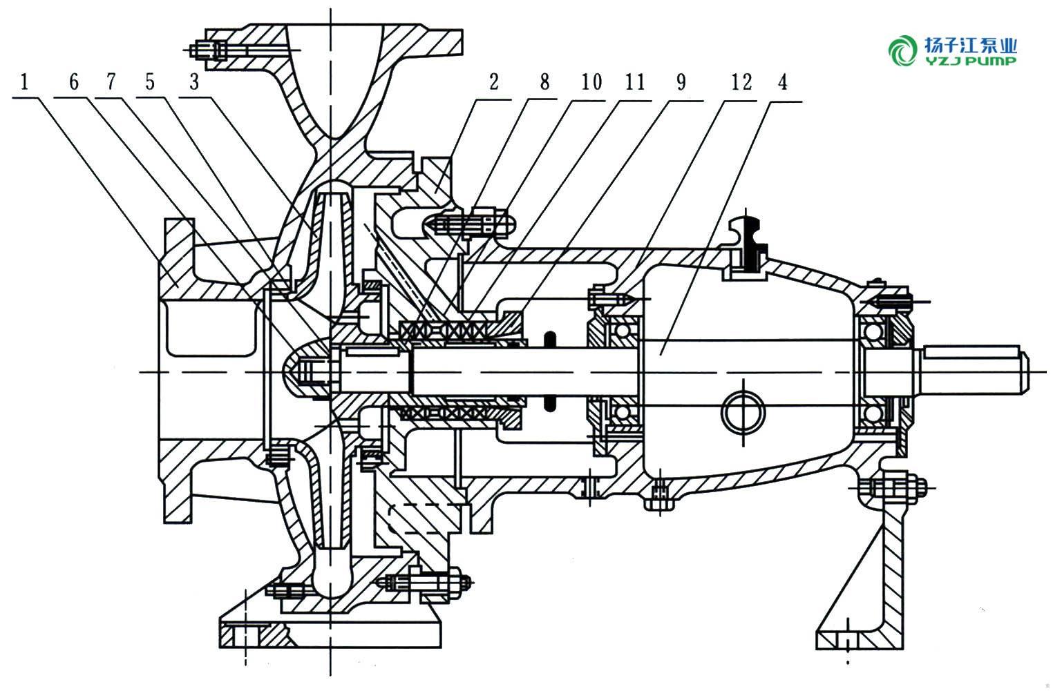 IS、IR型泵系根據(jù)國家標準ISO2858所規(guī)定的性能和尺寸設(shè)計的,主要由泵體(1)、泵蓋(2)、葉輪(3)、軸(4)、密封環(huán)(5)、軸套及懸架軸承部件(12)等所組成。