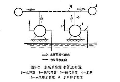 圖中供水管4必須與進(jìn)氣管6相接,在運(yùn)行過程中,氣水分離器的水在進(jìn)氣管低壓的作用下,沿著管4不斷向水環(huán)式真空泵內(nèi)供水。 水環(huán)式真空泵真空引水的步驟:首先關(guān)閉水泵壓力水管中的閘明,向水環(huán)式真空泵內(nèi)注水。注完水后,關(guān)閉漏斗上的閥門,并打開進(jìn)氣管上的閥門8及供水管的閥門3,然后開動(dòng)水環(huán)式真空泵。這時(shí),排氣管中有水和氣的混合物排出.開始時(shí),混合物中氣體占主要成份,隨后,水的成份越來越多,直到全部為水時(shí),說明水已全部充滿了水泵,于是引水完成,可以起動(dòng)水泵了。再速即關(guān)閉進(jìn)氣管上閥8,停止水環(huán)式真空泵運(yùn)行。 如果泵站中有兩臺(tái)以上的水泵,則可將水環(huán)式真空泵進(jìn)氣管與抽氣母管相通,每臺(tái)泵的泵殼頂部通過抽氣支管與抽氣母管相連。在每個(gè)支管上都安裝一個(gè)閥門,以便可以單獨(dú)對(duì)每一臺(tái)泵抽氣。有時(shí),為了備用起見,可以設(shè)置兩臺(tái)水環(huán)式真空泵,每一臺(tái)的進(jìn)氣管上都安上閥門。當(dāng)一臺(tái)發(fā)生故障時(shí),可以關(guān)閉該泵上的進(jìn)氣閥門,利用另外一臺(tái)抽氣,不致耽誤水泵的起動(dòng)。正常情況下兩臺(tái)水環(huán)式真空泵可對(duì)水泵同時(shí)抽氣,以加快引水速度。整個(gè)管路布置如圖5-2所示。
