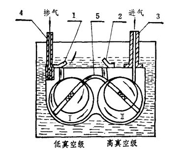 ![]() 圖2雙級泵的工作原理 1.低真空級排氣閥2.高真空級排氣閥3.進氣管4.摻氣閥5.中間通道 |