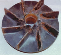 (1)汽蝕現(xiàn)象 對如右圖所示的入口管線,在0-0(位能基準(zhǔn)面)和K-K間列柏努利方程,得: 在貯槽液面上方壓力p0一定的情況下,若增加泵的安裝高度ZK(即Hg),則葉輪中心K處的壓力pK必然下降。當(dāng)ZK增加到使pK下降至被輸送液體在操作溫度下的飽和蒸汽壓時,則被輸送流體在葉輪中心處發(fā)生汽化,產(chǎn)生大量汽泡;汽泡在由葉片中心向周邊運(yùn)動時,由于壓力增加而急劇凝結(jié),產(chǎn)生局部真空,周圍液體以很高的流速沖向真空區(qū)域;當(dāng)汽泡的冷凝發(fā)生在葉片表面附近時,眾多液滴尤如細(xì)小的高頻水錘撞擊葉片。此種現(xiàn)象稱作“汽蝕現(xiàn)象”。 離心泵在汽蝕狀態(tài)下工作時,泵體振動并發(fā)出噪音;壓頭、 流量大幅下降,嚴(yán)重時不能輸送液體;時間長久,在水錘沖擊和液體中微量溶解氧對金屬化學(xué)腐蝕的雙重作用下,葉片表面出現(xiàn)斑痕和裂縫,甚至呈海綿狀逐漸脫落(見右圖)。 通過以上討論可以看出,安裝高度過高將會導(dǎo)致葉輪中心處的壓力過低,從而發(fā)生汽蝕。只要泵的實(shí)際安裝高度低于允許安裝高度,則操作時就可避免發(fā)生汽蝕現(xiàn)象。
