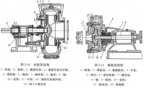 襯膠泵結構如圖2-40所示。其大流量可達1500m3/h,大揚程可達50 m,高使用溫度80℃,高使用壓力1.6 MPa。襯膠泵能用于輸送硫酸、鹽酸、磷酸、氫氟酸、氫氧化鉀等強腐蝕性介質,并適合輸送含有顆粒的腐蝕性液體,但不能用于輸送濃硫酸、濃硝酸等強氧化性酸。
