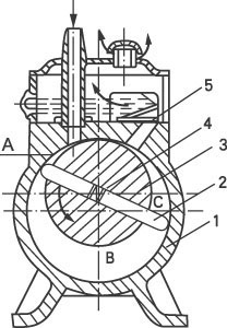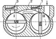 | 雙級旋片式真空泵工作原理圖 1-高級排氣閥;2-通道;3-低級排氣閥 | ||||