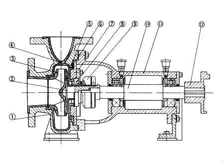 IHF型氟塑料離心泵的泵體材質采用金屬外殼內襯聚全氟乙丙烯(F46)、葉輪和泵蓋均采用金屬嵌件外包氟塑料整體燒結壓制成型,軸封采用外裝式波紋管機械密封,靜環選用99.9%氧化鋁陶瓷或炭化硅,動環采用四氟填充材料或炭化硅。其特點是該泵結構先進合理,耐腐蝕強,密封性能嚴密可靠,工作穩定,噪音低,使用壽命長。