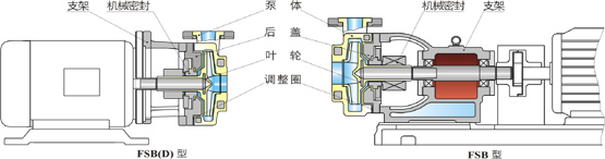 FSB和FSB-D氟塑料合金離心泵采用目前為先進的外裝式四氟波紋管機械密封,其特點是能補償泵軸的徑向跳動,單端面密封外裝式、易裝卸、工作狀態直觀、耐腐耐磨密封性能好、擁有多層保護,延長了機封使用壽命;對于輸送含雜質顆粒腐蝕性介質時,可配用無冷卻水單端面硬對硬(碳化硅對碳化硅)機械密封,強堿與氫氟酸等特殊腐蝕性介質配用無壓燒結碳化硅密封;用戶選型時需考慮到介質中的固體含量及介質特殊腐蝕性.
