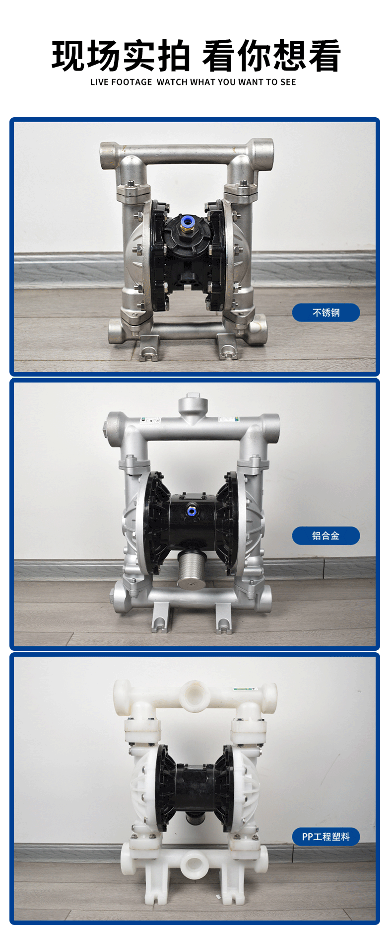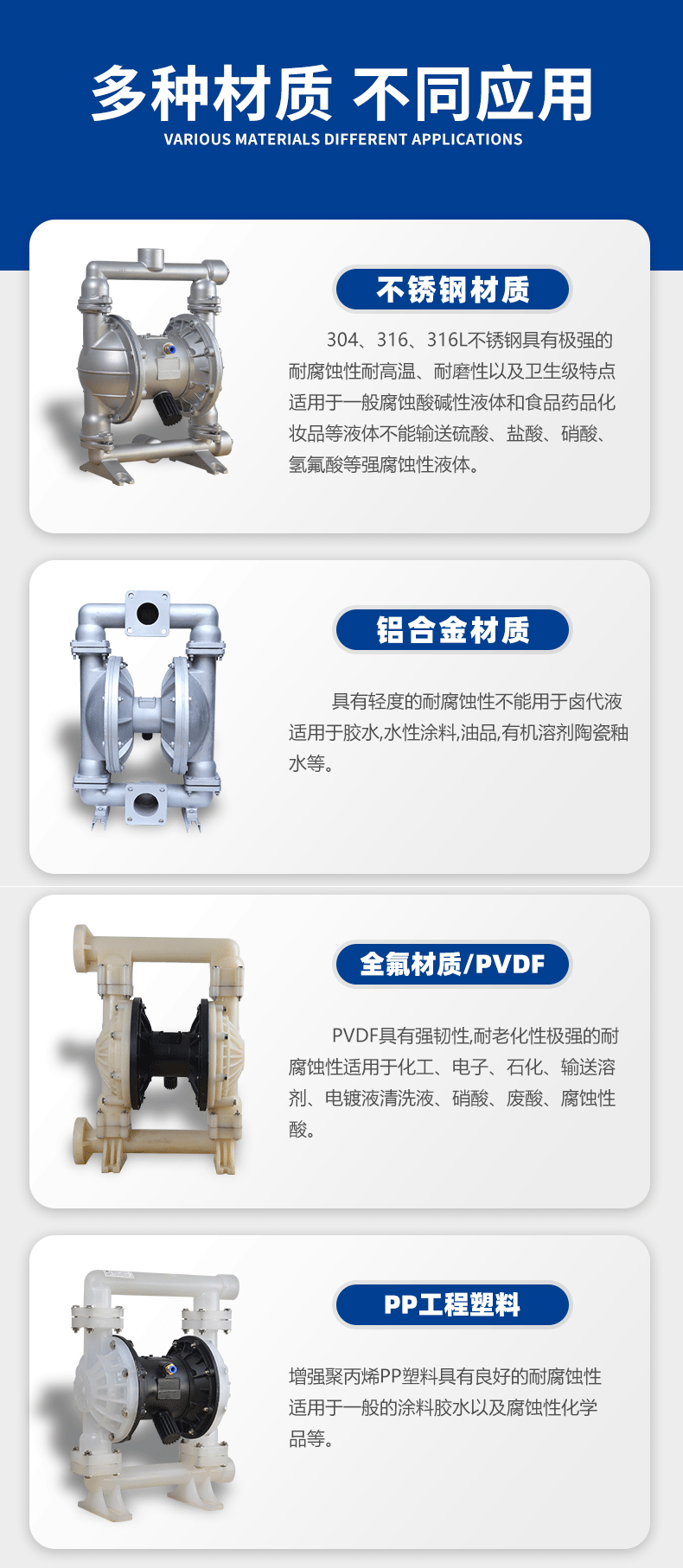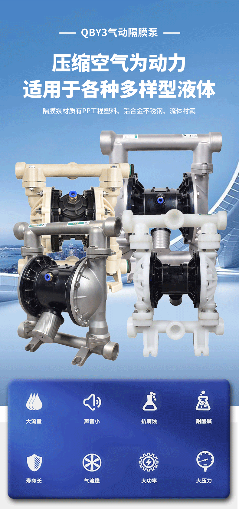QBY系列氣動隔膜泵是一種新型輸送機械,是目前國內新穎的一種泵類。采用空氣壓縮機壓縮空氣為動力源,對于各種腐蝕性液體,帶顆粒的液體,高粘度、易揮發、易燃、劇毒的液體,均能予以抽光吸盡。其性能參數與聯邦德國的 WLLDENPVMPS、美國的MARIOWPUMPS相近.本廠目前已形成系列化生產