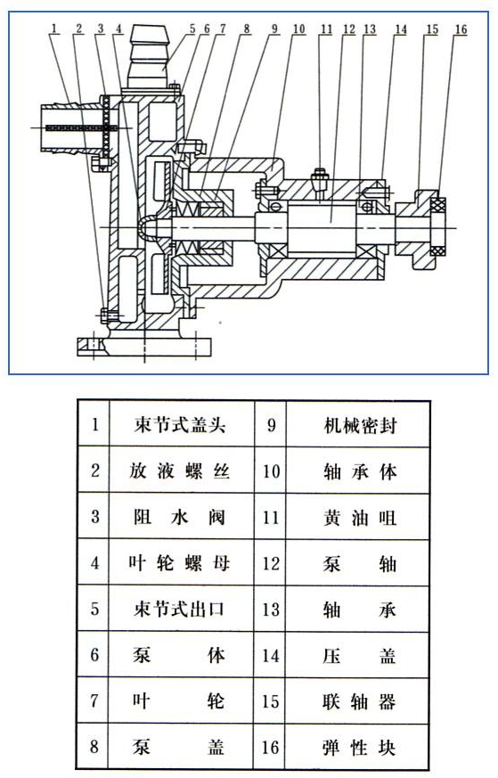 1.泵的主要零件有:泵體、葉輪、泵軸、機械密封、懸架等。