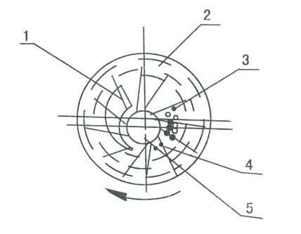 如圖(一)所示,葉輪偏心地安裝在泵體內,泵起動時,向泵內注入一定高度的水,當葉輪旋轉時,水受離心力的作用而在泵體內壁形成一旋轉水環,水環下部內表面與輪轂相切,沿箭頭方向旋轉時,在前半轉過程中,水環內表面逐漸與輪轂脫離,因此在葉片間形成空間并逐漸擴大,內部壓力低于入口處壓力,此時吸入氣體。在后半轉過程中,水環內表面逐漸與輪轂靠近,葉片間的空間容積縮小,氣體壓力高于大氣壓時被排出。如此葉輪反復工作,泵就連續不斷地抽吸氣體。