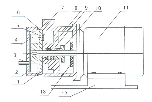 1、圓盤 2、泵蓋 3、進水管 4、葉輪 5、橡膠球 6、擋板 7、泵體 8、封液環 9、填料 10、填料壓蓋 11、電機 12、底盤 13、擋水圈