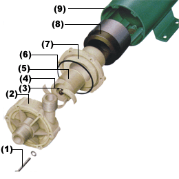 部 件 1、固定螺絲及墊圈 2、泵殼 3、泵軸 4、葉輪 5、被動磁鐵 6、密封圈 7、隔離套 8、主動磁鐵 9、電機 |